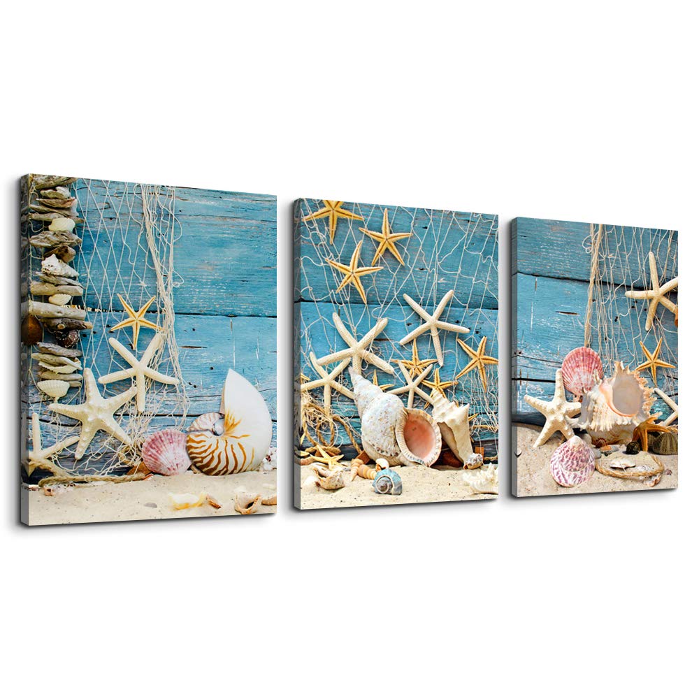 Vvovv wall decor teal blue bathroom wall decor seashell coral starfish decor painting ocean sea pictures art print on canvas stretched and framed ready to hang 12x12inchx3pieces 48 out of 5 stars 9. Canvas wall art bathroom wall decor starfish shell fishing net sands beach 3 pieces contemporary pictures modern canvas artwork for home decoration framed ready to hang gray blue themes 12 x 16 47 out of 5 stars 156. Save 5 with coupon.